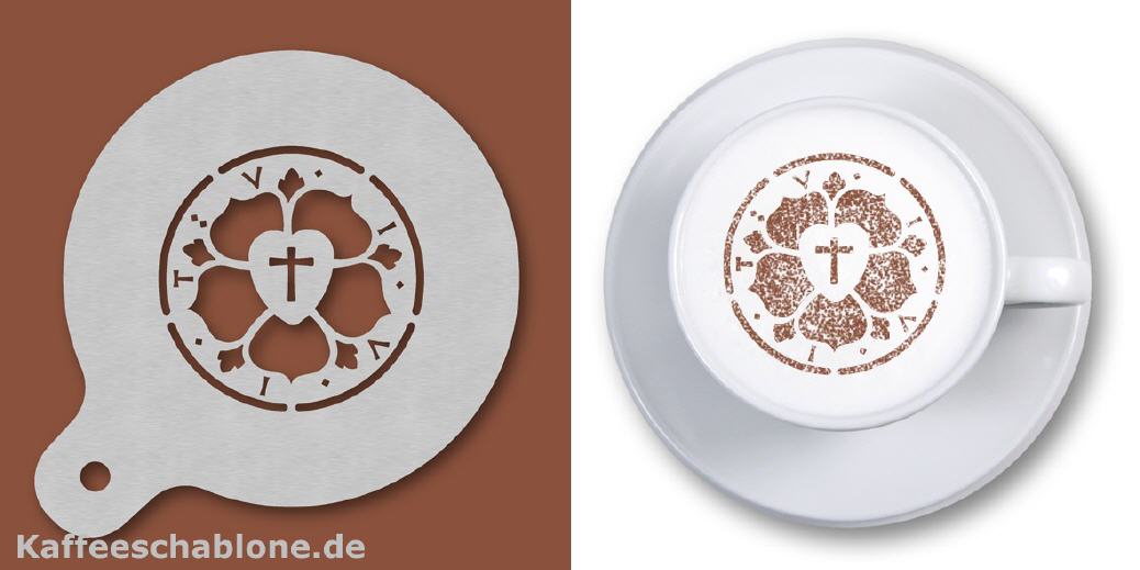 Die abgebildete Dekoschablone hat als Motiv die Lutherrose; sie wurde für eine Werbekampagne konzipiert. Sie wurde für die Dekoration von Kaffeevarianten und verschiedenen Gebäcken hergestellt.