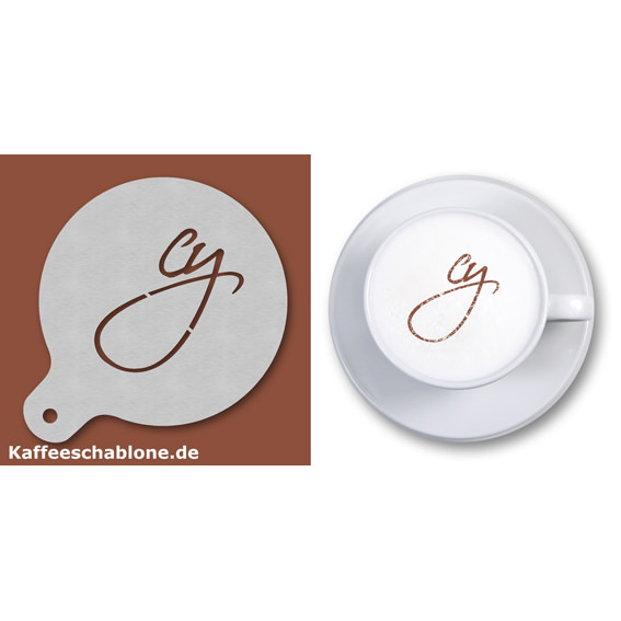 Die abgebildete Kaffeeschablone hat als Motiv die Buchstaben CM und steht später als Firmenlogo auf dem Milchschaum. Diese Schablone wurde für den Einsatz in einem Streuer konzipiert.